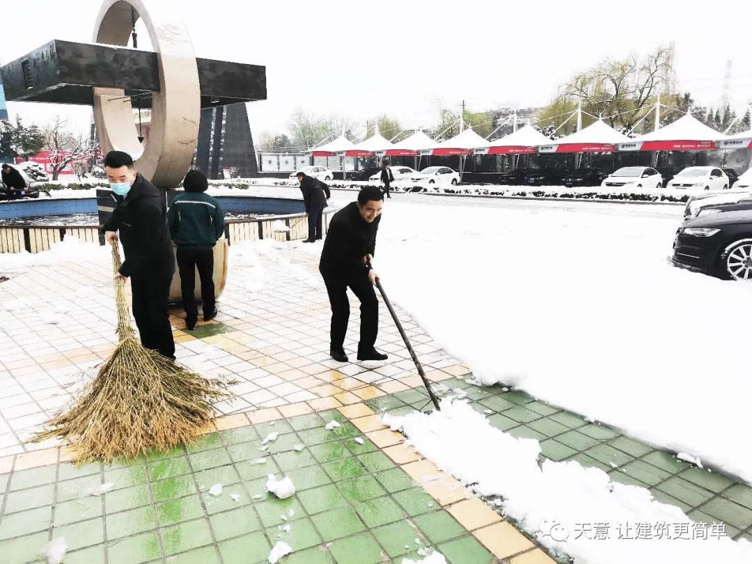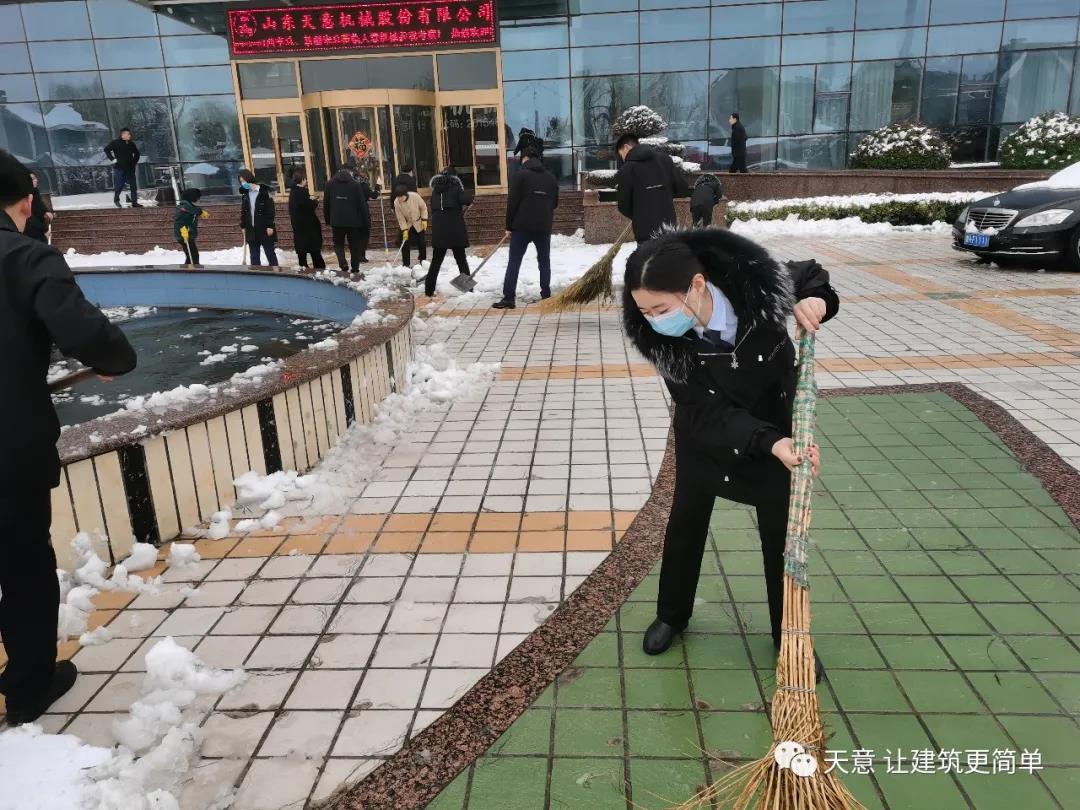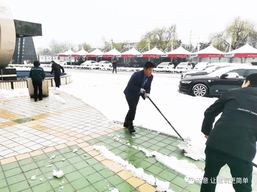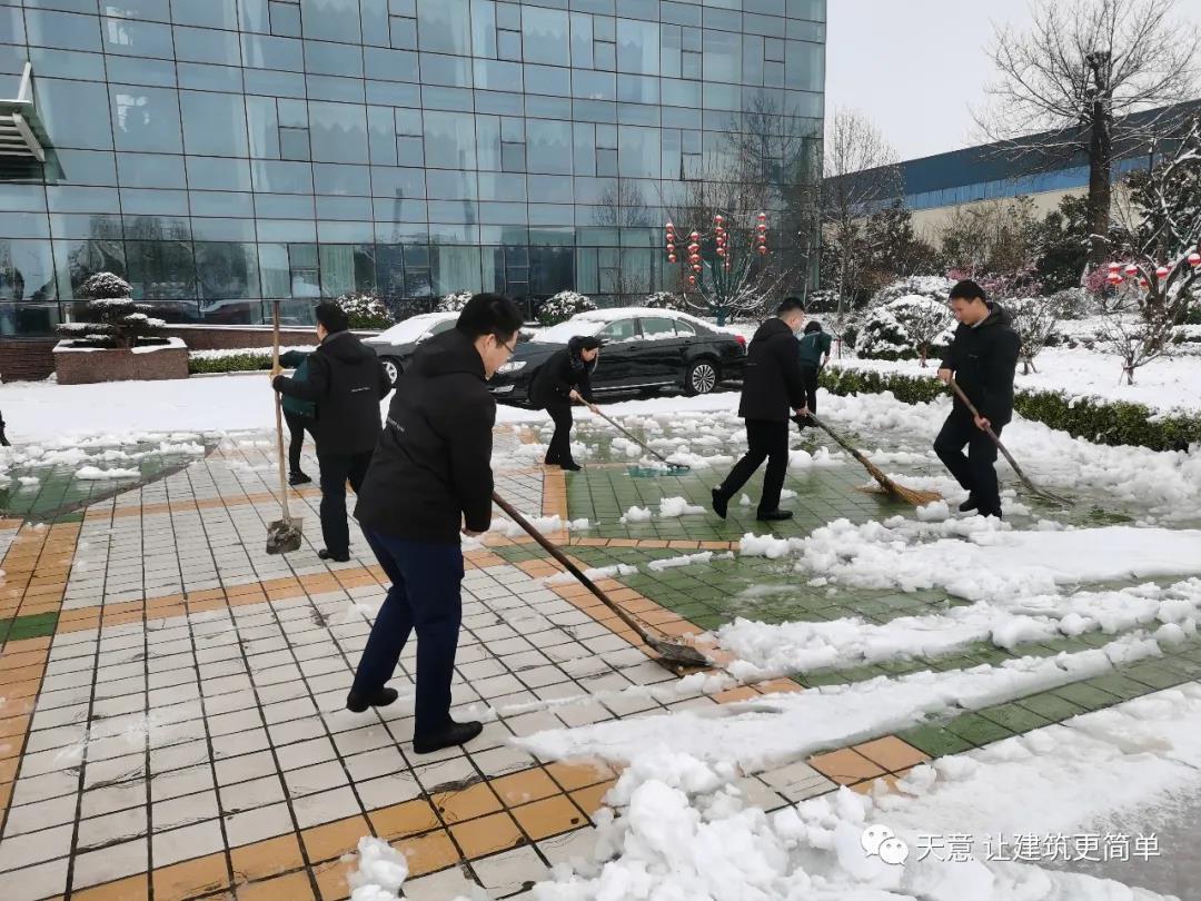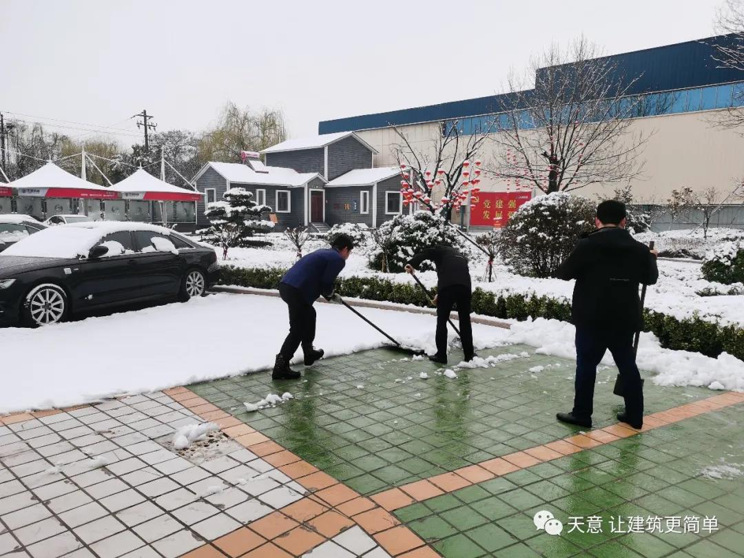 大雪悄然而至,一覺起來,窗外已是銀裝素裹。然而大雪的降臨也給大家的出行帶來諸多不便,公司大門口、辦公樓前的道路都被皚皚白雪覆蓋。早晨上班前,公司總經理劉海龍、營銷總監郭川東帶領公司員工拿起掃帚鐵锨,滿懷激情,投入除雪當中。整個除雪作業過程井然有序,熱火朝天,干勁十足,大家不懼寒冷,不怕手凍。鐵锨和地面的碰擊聲、掃帚清掃雪花的刷刷聲,不一會兒辦公樓前的積雪已蹤影全無,所到之處,雪沒了,路干凈了,掛滿枝頭的冰凌隨風婆娑起舞,點頭稱贊,大家的心中更是無比的欣慰,雖然凍紅了臉、累出了汗,但累并快樂著。