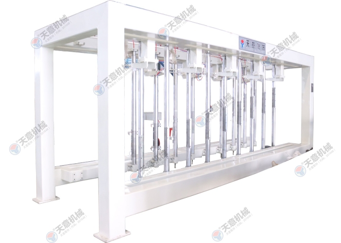 切割機中間位置停止后,由小車置換裝置將側板連同坯體抬起,切割小車退回翻轉行車底下進行下一次承載脫模后的坯體,另外一部切割小車