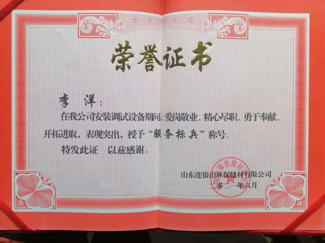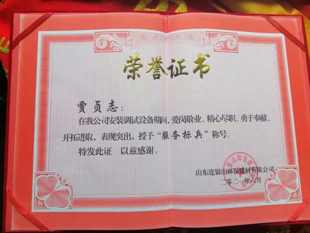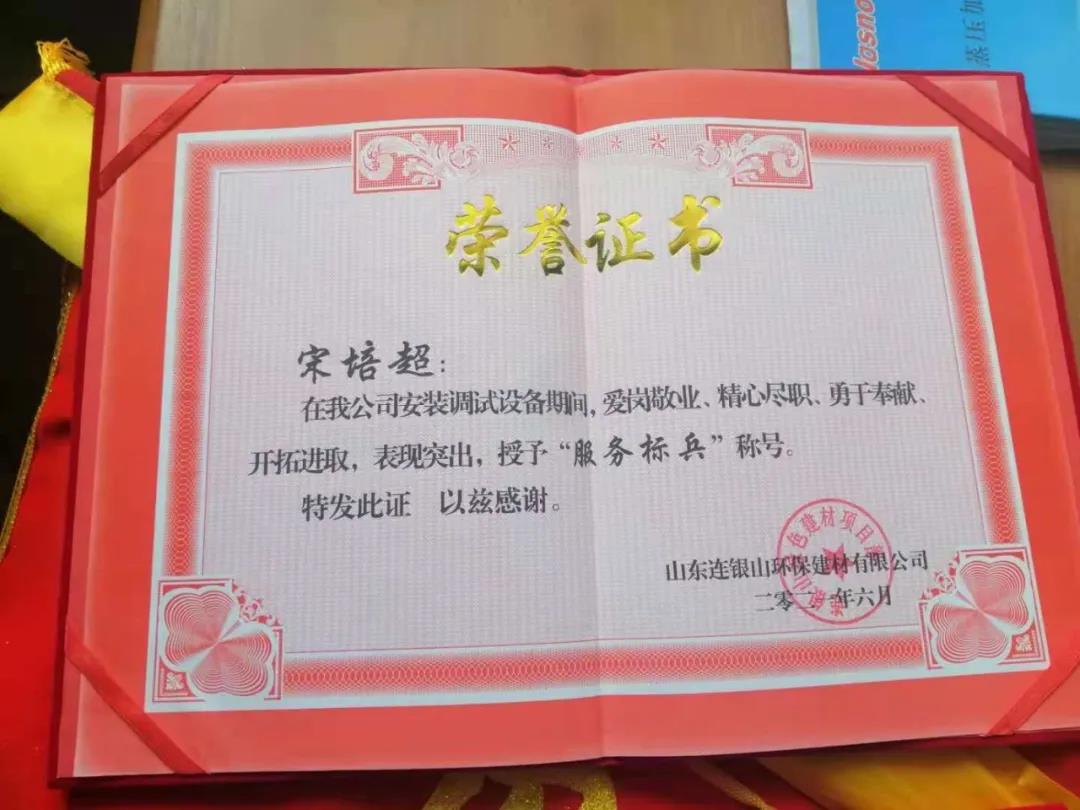 炎炎夏日,天意機械在向客戶山東連銀山環保建材有限公司售出保溫裝飾一體化板生產線之后,隨即派出售后團隊對設備進行安裝調試及售后培訓。售后團隊不畏酷暑,精心、耐心、專業地為客戶進行安裝調試,贏得了客戶的好評和認可,客戶為表達謝意,特授予天意機械售后人員榮譽證書和錦旗,以表彰售后人員愛崗敬業、精心盡職、勇于奉獻、開拓進取的精神。