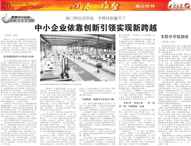 2015年1月25日的大眾日報?兩會特刊《獨門絕技創市場 專精特新贏天下――中小企業依靠創新引領實現新跨越》重點介紹了我公司技術創新的經驗,敬請關注。